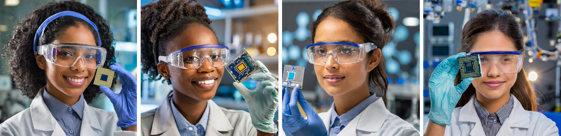 How might we further engineer our prompt? Perhaps we can prompt the AI with this statement: “A female physicist wearing lab goggles, holding a semiconductor”: