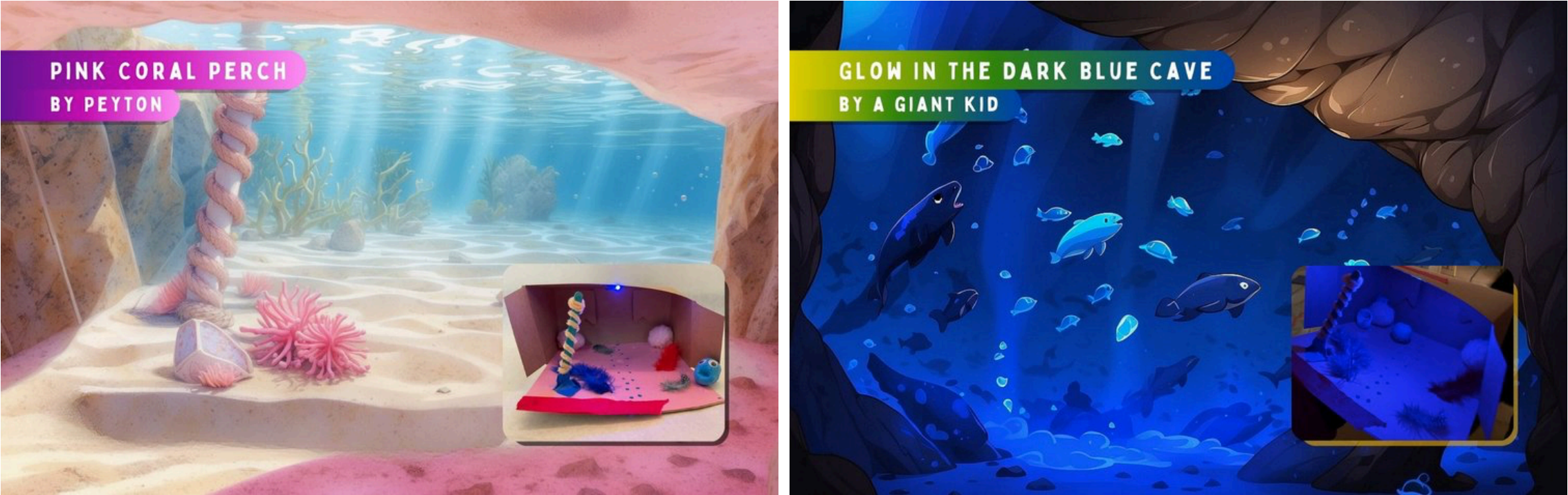 INTEGRATE THIS ACTIVITY AS PART OF YOUR MAKER CURRICULUM: Students may use arts and crafts materials such as paper, cardboard, modeling clay, craft sticks, and more to make dioramas of their settings. They can then use photos of their dioramas along with a description of their setting as a reference in their AI modeling. Here are two examples of underwater diorama’s GIANT kids have built: