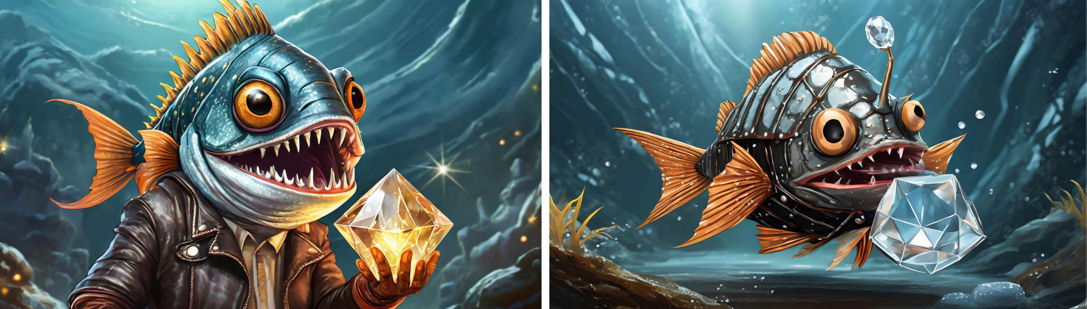 Example: A scary angler fish with sharp teeth wearing a leather jacket and holding a diamond, 3D style