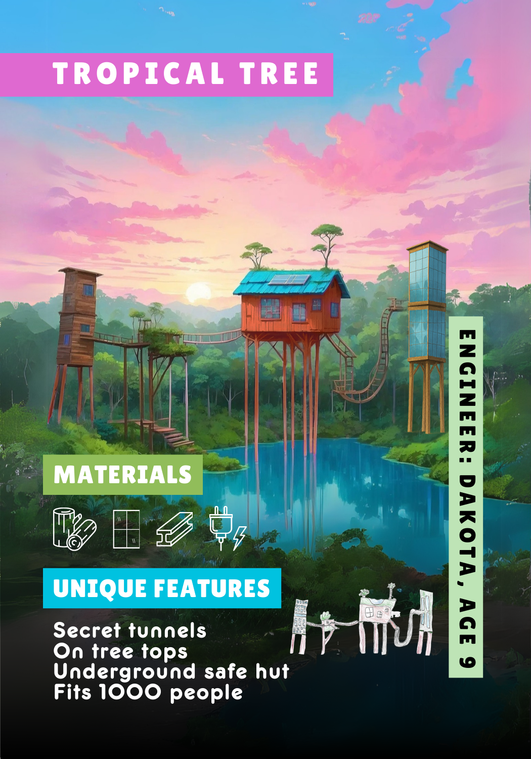 Excited, she shows her card to her cousin and best friend, who submit their own dream structures: a tropical tree house, a dragon warehouse.