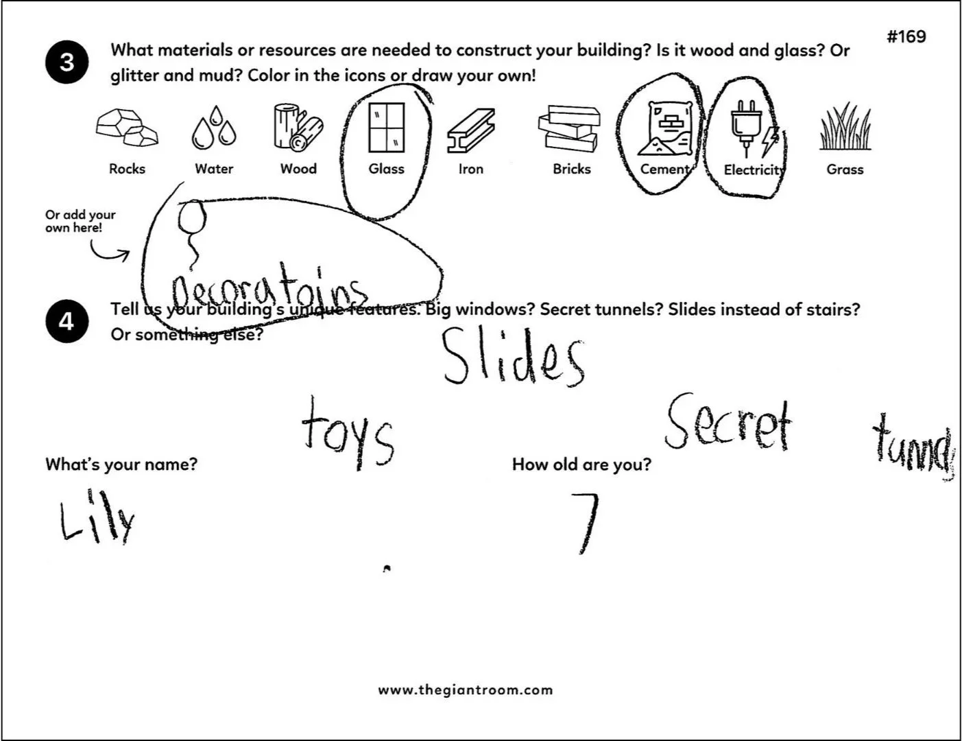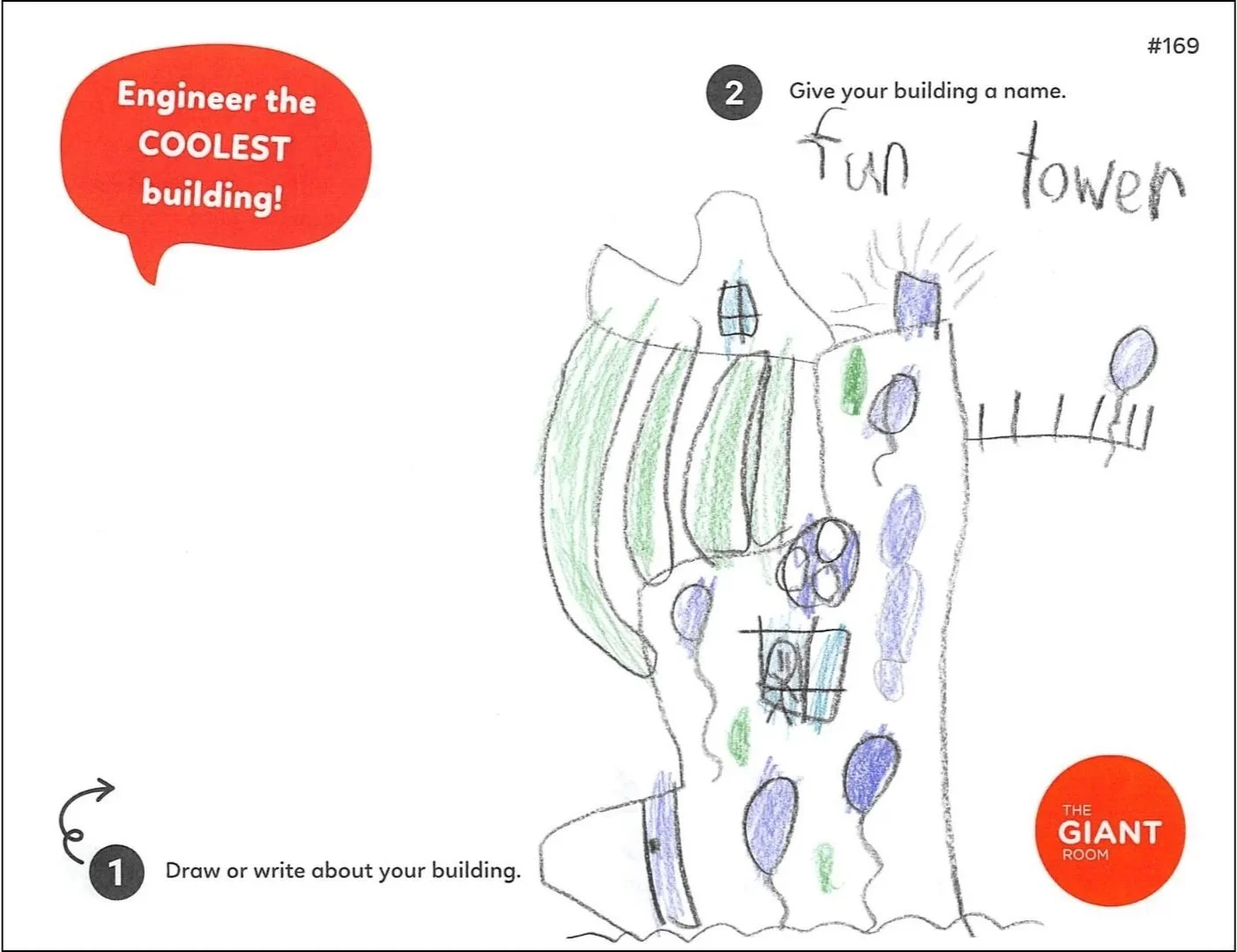 On a visit to her public library, Lily (age 7) spots a “Build a Dream City” Creative Mission poster at a GIANT Remix table.