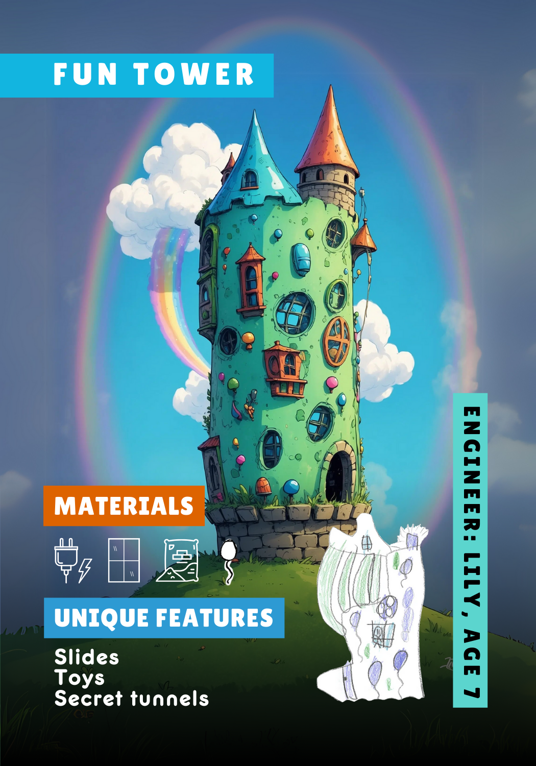 She grabs a Mission Sheet and starts designing like an engineer—sketching a detailed “fun tower” made of glass, cement, electricity, and decorations, complete with slides, toys, and secret tunnels.
