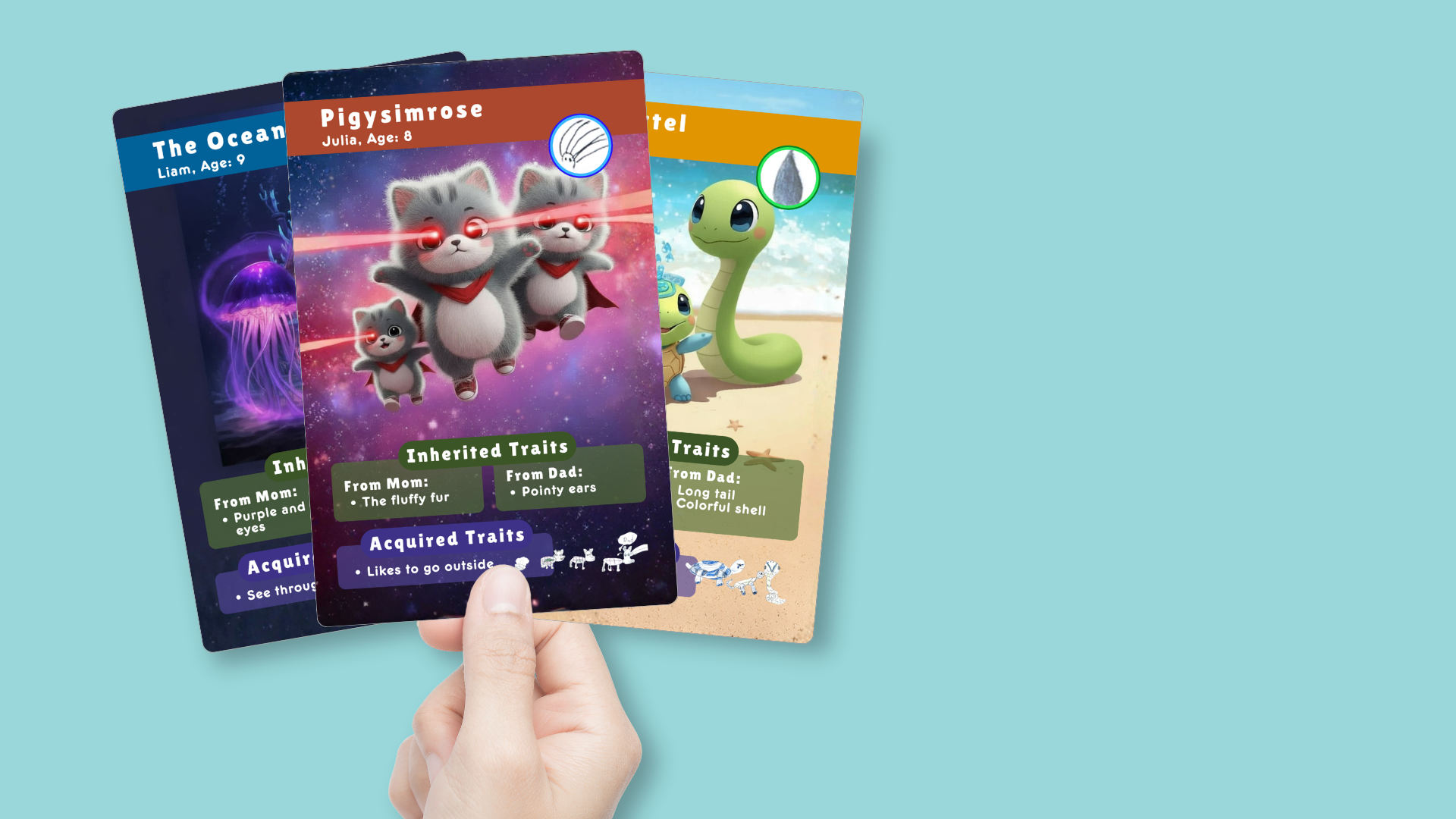 As part of the school’s Inheritance and Traits science unit, the program focused on animal families, their genes, and their offspring’s inherited and acquired traits. Students created their own “Animal Families” with special traits and powers, then wrote fictional stories about their Animal Family on vacation, highlighting those inherited and acquired traits. Their completed work is featured in this book, along with a set of collectible Animal Family trading cards.