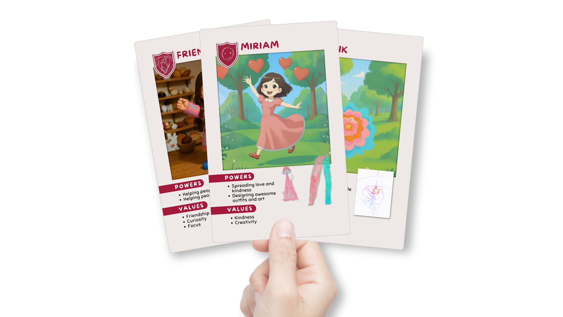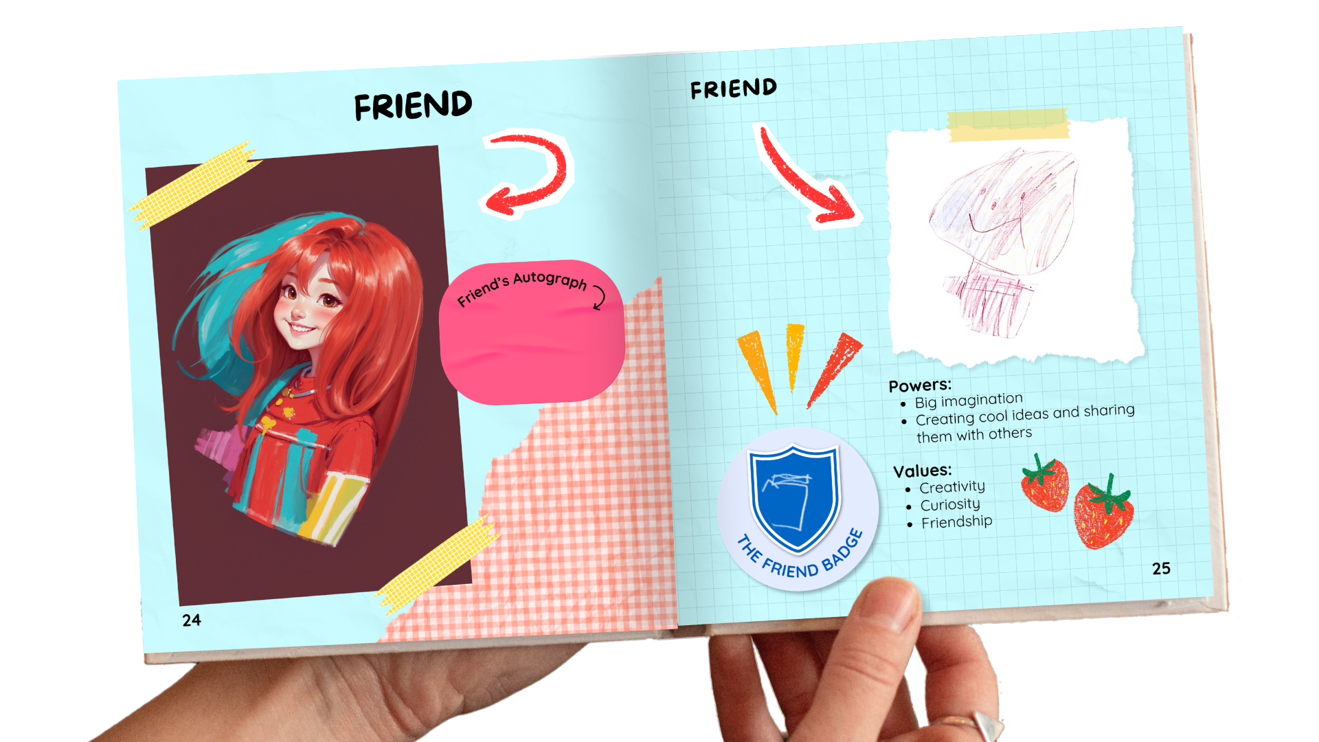 Nine (9) participants responded to this Creative Mission, sketched and described their idea of their civics role. The GIANT Room then “remixed” their self-portraits into a one-of-a-kind set, inviting all kids (and adults) to collect the polaroid trading cards of their fellow community members and flip through the photo album to learn how each one contributes to the community, what values are important to them, and what badge of honor they wear proudly. Participants are also encouraged to sign their autograph on their spread in the printed copy of the photo album for the library.