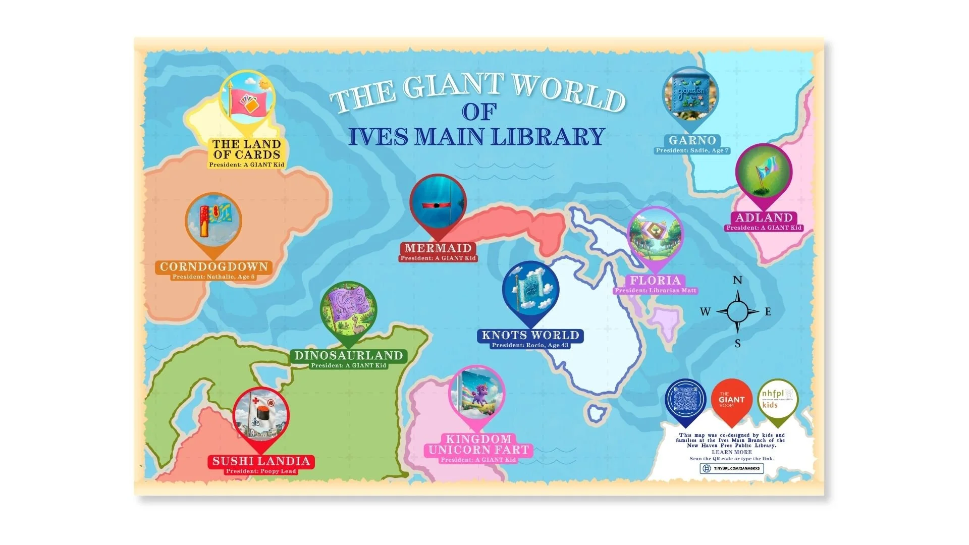 Together, they imagined their very own nations - designing flags filled with meaning, sharing the laws that guide their communities, and how their countries care for every citizen. The GIANT team of designers and educators transformed these ideas into AI avatars and published them as a deck of cards, each card featuring one idea. The GIANT World of Ives Main Library map showcases all the new countries and flags.