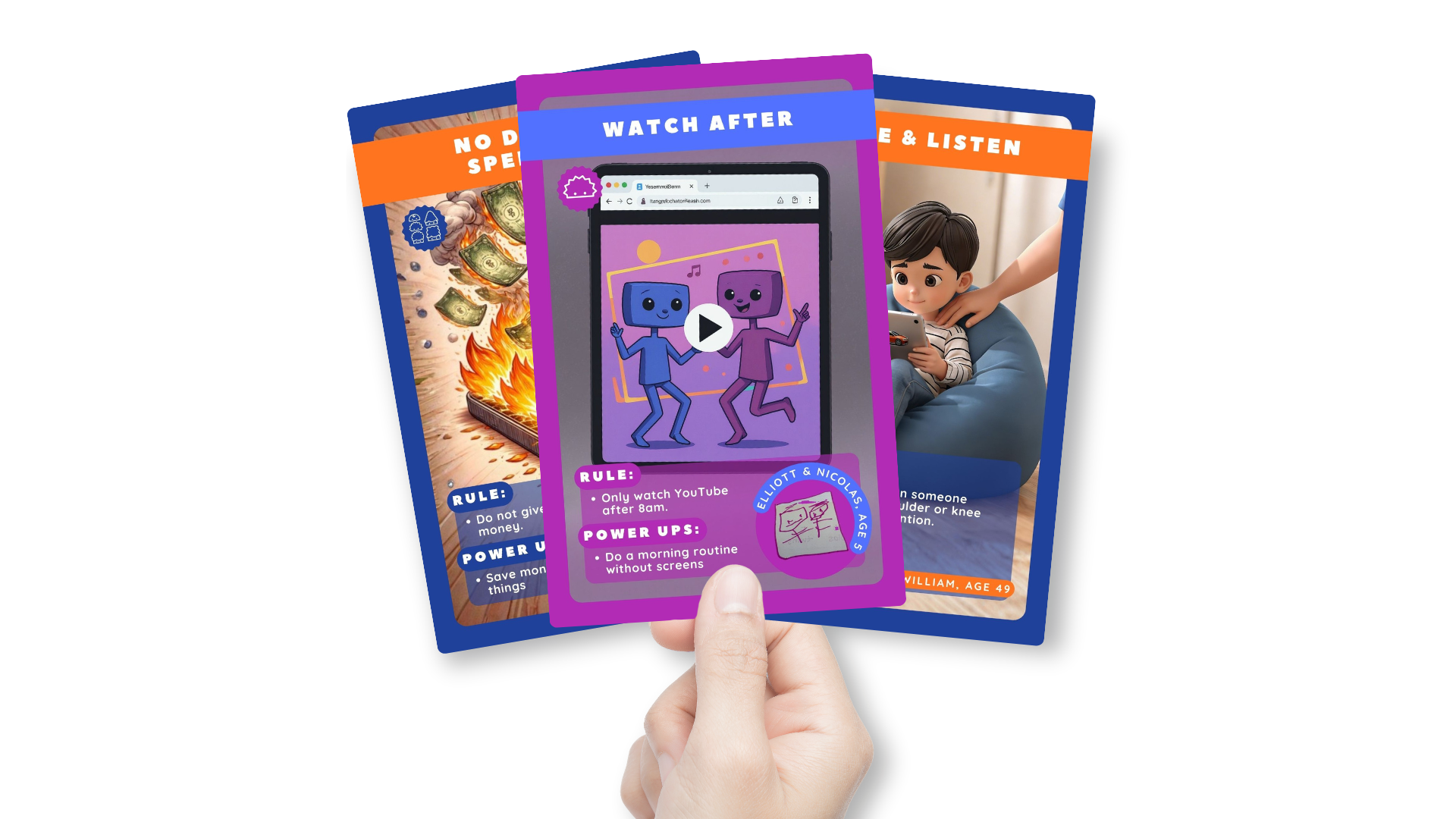 GIANT Family Resource: Family Phone Rule Trading Cards & Family Phone Contracts includes a deck of trading cards featuring original research-backed phone rules by kids and families, their power ups, and who these rules are for. These cards are paired with a Family Phone Contract. Check out the free e-cards, download and make your own DIY cards, or order professionally-printed copies. Then, download the free Family Phone Contract and use the cards as inspiration to help YOUR family create healthy boundaries with cellphones.