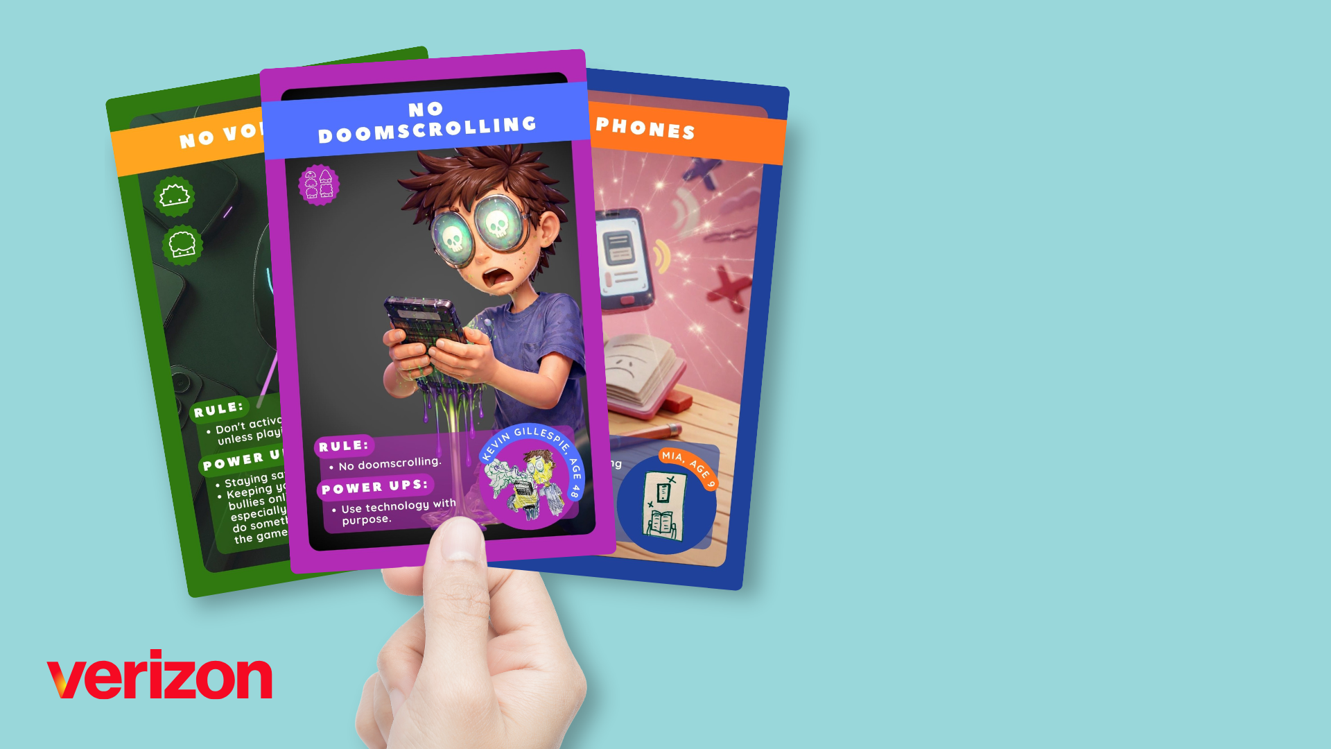 Co-designed by GIANT kids and families and our GIANT team of educators, designers, and artists, this family resource set was created to help improve digital wellness and set healthy phone boundaries in our homes. In partnership with Verizon and the Joan Ganz Cooney Center at Sesame Workshop, participating kids and families responded to the Digital Wellness Mission, “Make your own rules for cellphones!”, and with the GIANT Remix app, we turned their ideas into trading cards: