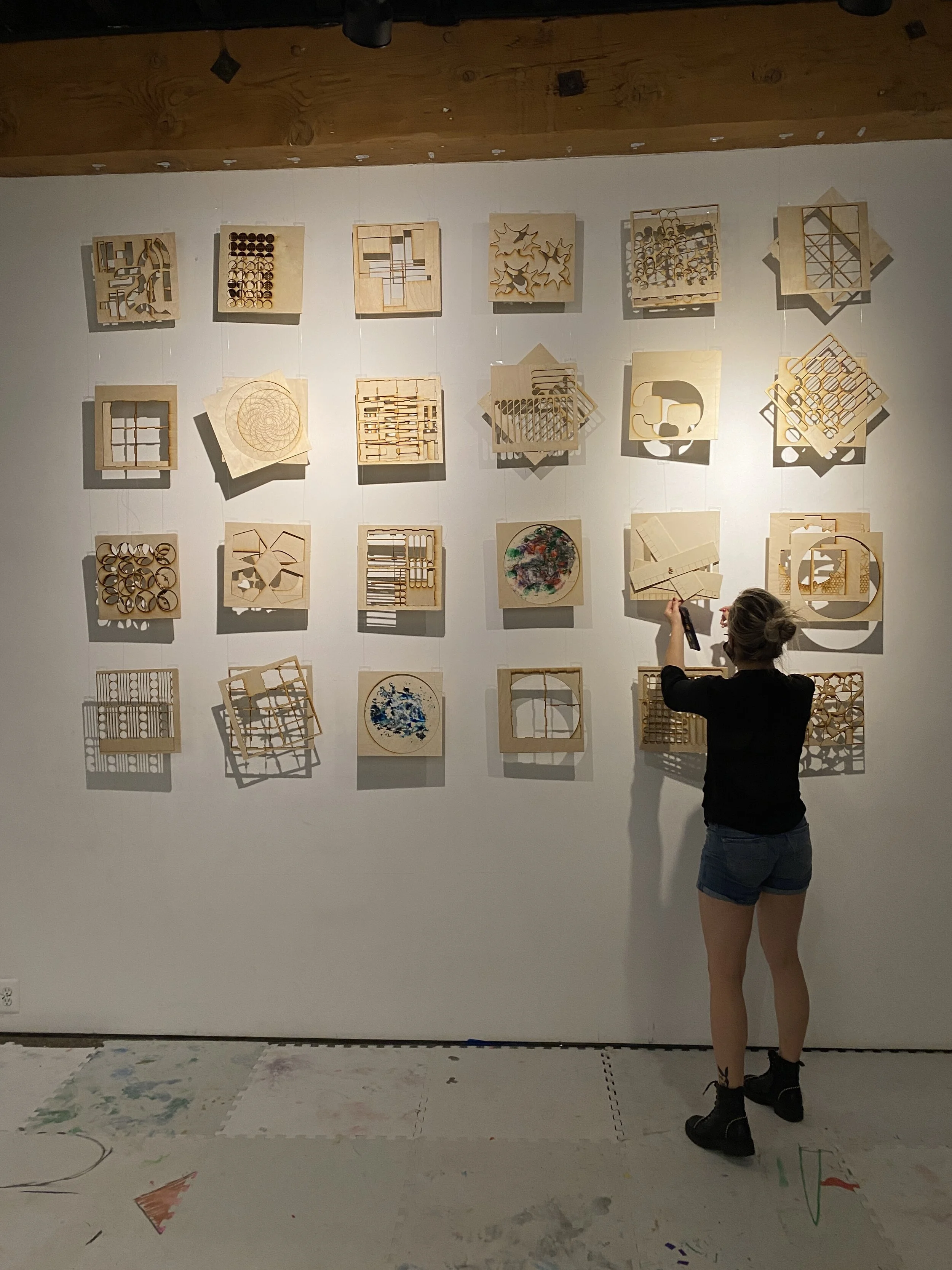 The collaborative nature and sustainable approach to art, incorporating integrative perspective, deeply rooted in collage style but with organic mass and subject matter. The creative process involved switching between people’s touches to make art transformative and not belonging to one but to many. “Portals” repurposes excess wood from the laser cutter leftovers, and creates new geometric forms with aims of sustainability, collaboration, and transformation