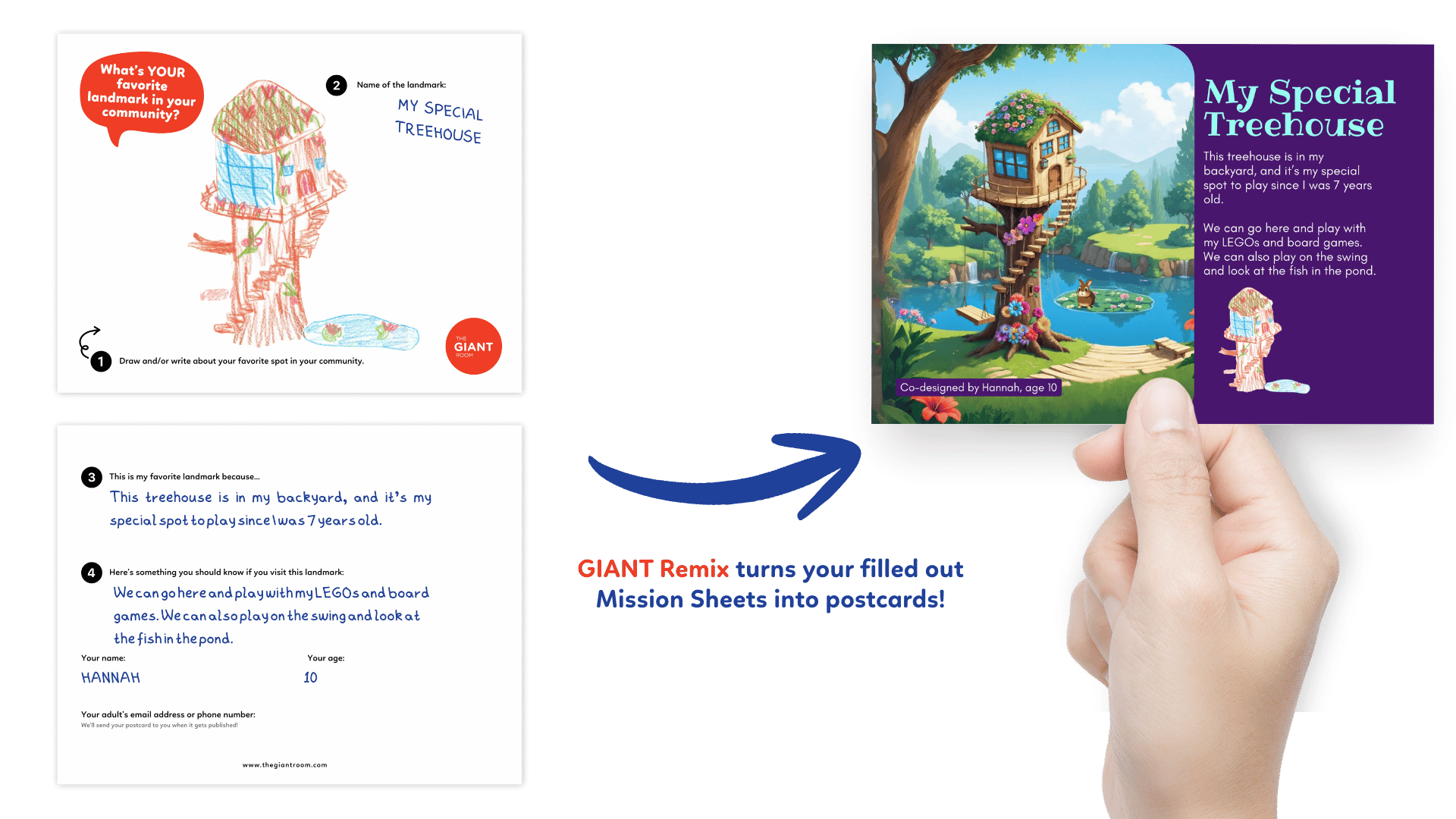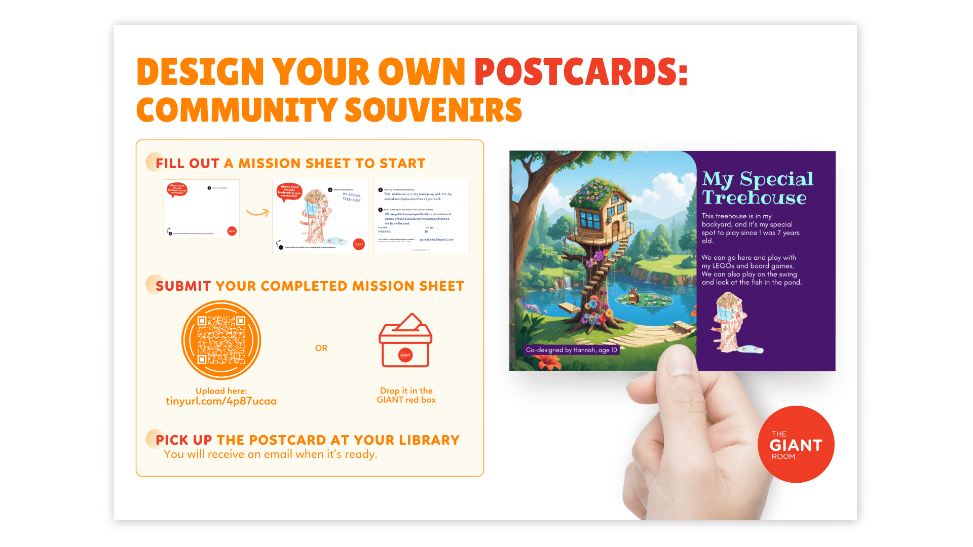 Professionally printed postcards will be shipped to the library for you to pick up within one month of your submission! You can also check out the full collection of postcards and the published activity book at your library branch or online on the GIANT website - all completely free of charge.