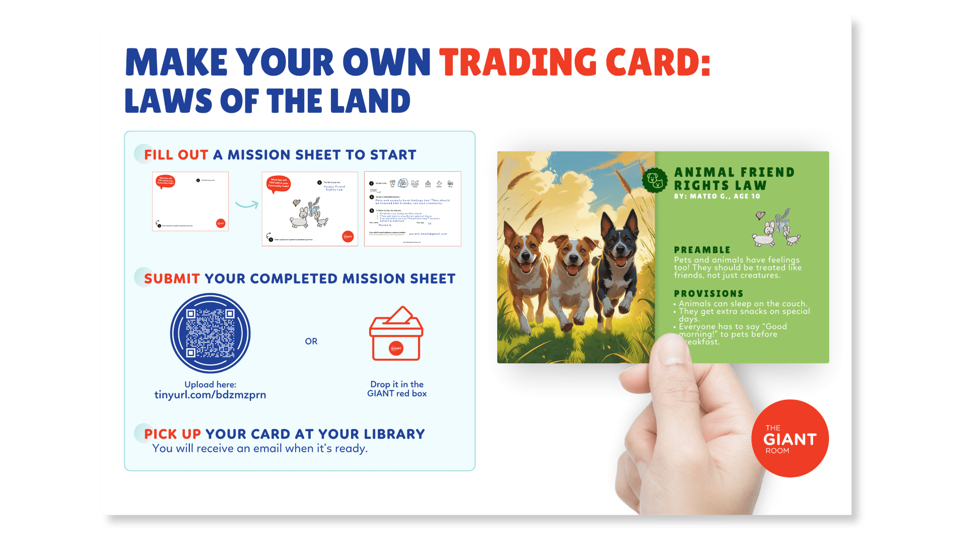 Professionally printed cards will be shipped to the library for you to pick up within one month of your submission! You can also check out the full deck of cards and the published game book at your library branch or online on the GIANT website - all completely free of charge.