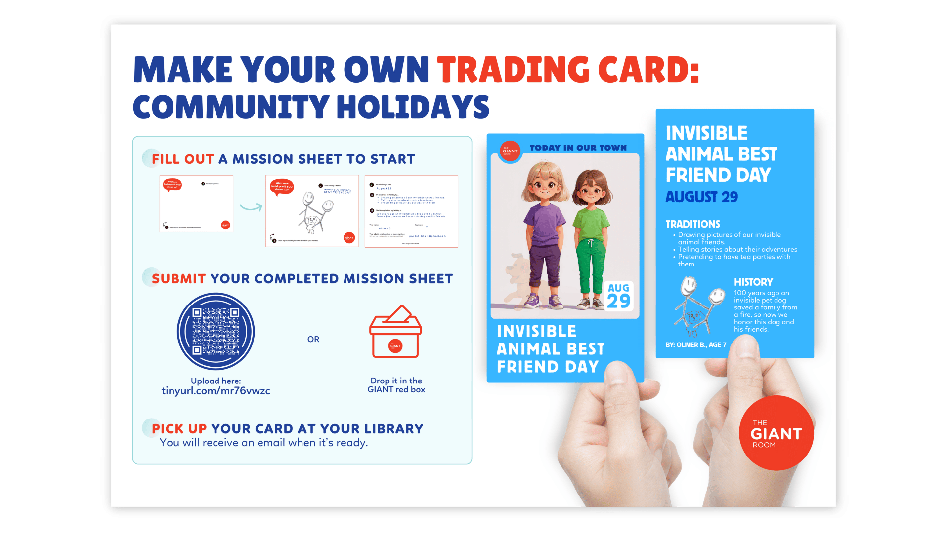 Professionally printed cards will be shipped to the library for you to pick up within one month of your submission! You can also check out the full deck of cards and the published calendar poster at your library branch or online on the GIANT website - all completely free of charge.