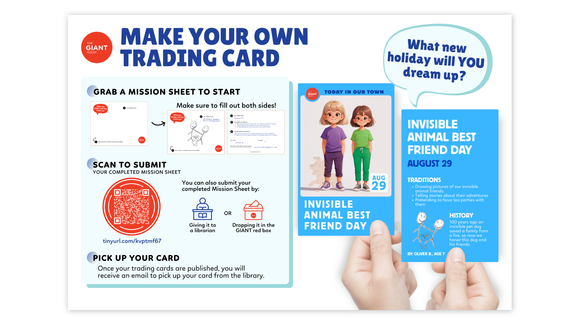 Professionally printed cards will be shipped to the library for you to pick up within one month of your submission! You can also check out the full deck of cards and the published calendar poster at your library branch or online on the GIANT website - all completely free of charge.